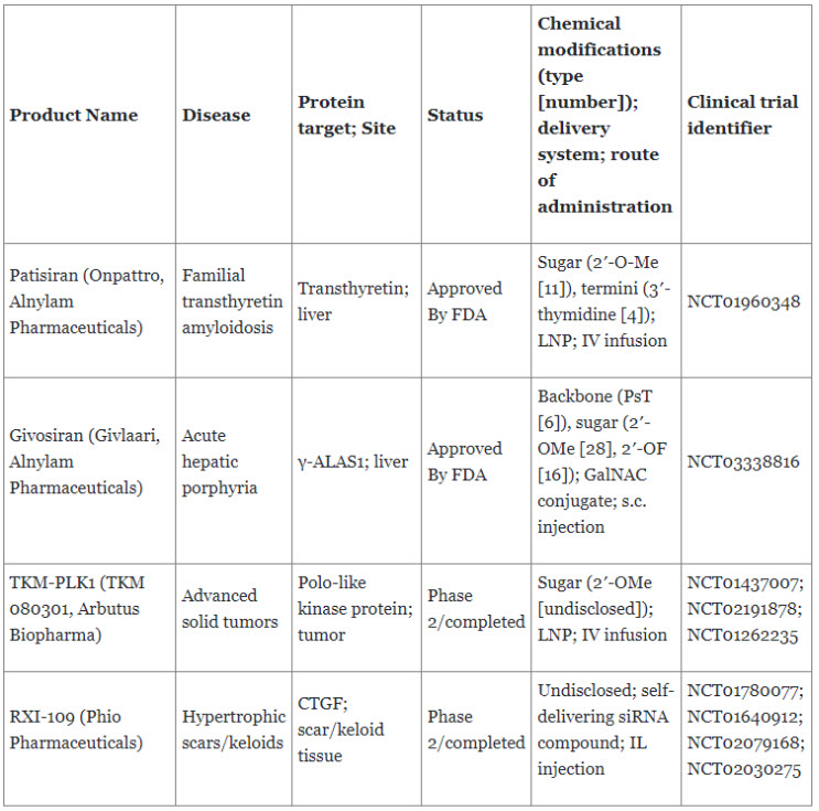 The table below shares siRNA therapeutics that have been approved and siRNA therapeutics in development.