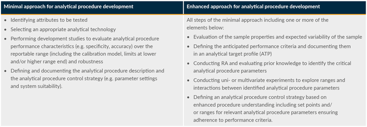 Table 1: The minimal approach and enhanced approach for analytical procedure development according to ICH Q14.