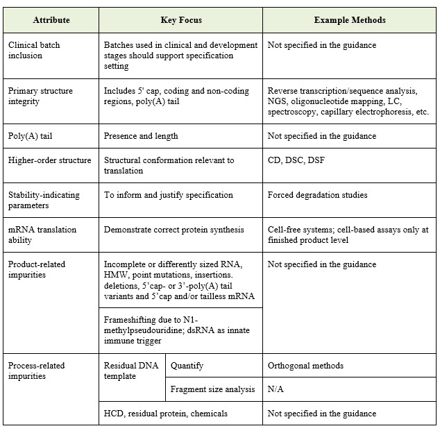 The guideline specifies a number of key quality attributes and analytical approaches that should be addressed during characterization. These are summarized in the table below: