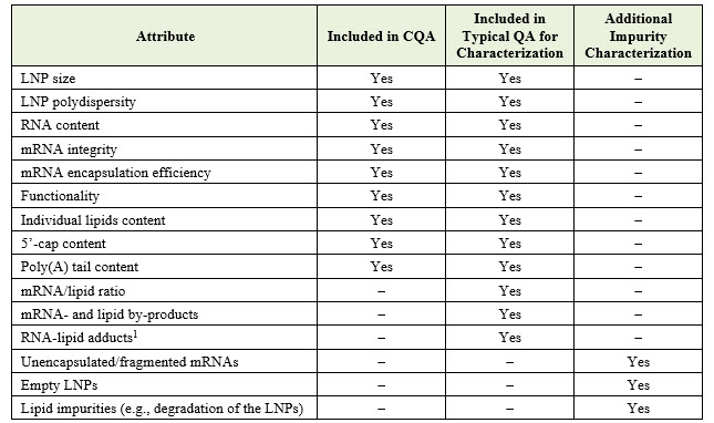 Below is a list of attributes relevant to pharmaceutical development, indicating whether each is identified as a CQA, discussed as a typical quality attribute, and/or mentioned as a product- or process-related impurity requiring characterization: