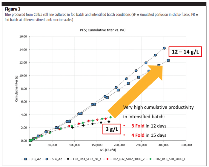 Using the fed-batch culture conditions, 25 x 106 cells were produced, whereas a higher cell density of 30 x 106 cells was achieved using the simulated perfusion conditions. This cell density was deliberately restricted by a temperature dropinduced cell growth arrest (Figure 2). Although the cell density achieved was not significantly higher, the titres were (Figure 3). With the fedbatch conditions, 3 g/L was produced, whereas the Cellca CHO cells cultured using the simulated perfusion conditions produced a three-fold greater titre in 12 days and a four-fold titre increase to 12–14 g/L in 15 days.2