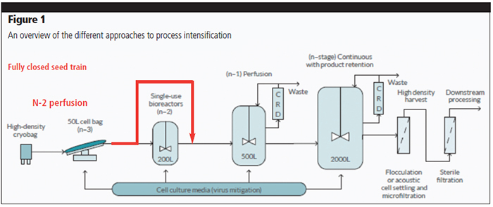 Currently, the biopharmaceutical industry is concentrating on three areas in which upstream bioprocessing can be intensified. The first is in the seed train; here, intensification can be achieved by directly inoculating cells from high cell density cell banks into rocking motion (RM) bioreactors and is a strategy that biopharmaceutical companies are implementing as it eliminates the need to use shake flasks in the post-thaw expansion phase. Also in the seed train, perfusion approaches — whereby cells stay in the exponential growth phase throughout the entire culture — are being used to skip steps or generate higher cell densities to inoculate the production bioreactor. For example, an N-3 culture in a RM50 bioreactor (5–25 L working volume) can be used to directly seed a 500 L bioreactor to skip the N-2, 200 L bioreactor stage; or, an N-1 500 L culture in a stirred or RM bioreactor can be used to seed a production culture with a final volume of 2000 L at a high inoculation density. These different seed train intensification approaches are shown in Figure 1.