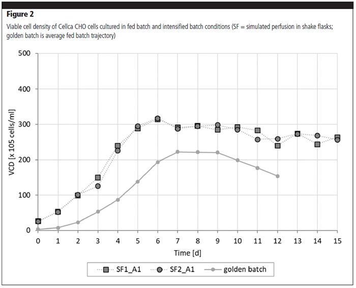 For process intensification in the seed train or main bioreactor, cell lines that can be cultured in perfusion conditions are required and SSB offers the Cellca CHO Expression Platform for this application. To demonstrate the performance of these cells under perfusion conditions, Cellca CHO cells expressing a model mAb (IgG1) antibody were cultured in fed batch and simulated perfusion conditions with a shaker-intensified batch simulation protocol using daily centrifugation and medium replacement with standard Sartorius cell culture media and feed mix (1 volume/day perfusion for 15 days).