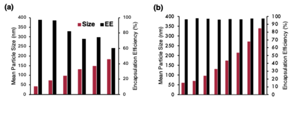 Figure 2 - Comparison of mean particle size and corresponding encapsulation efficiency between the conventional manufacturing approach and the new two-stage, ideal-mixing process.
