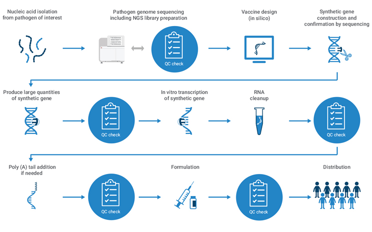 The diagram below shows a common RNA-based vaccine production workflow and recommended sample quality control steps (blue).