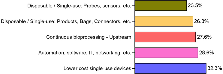 Costs of SUS were also an issue pre-pandemic. But costs rose substantially due to supply challenges during COVID. As a result, demand for lower-cost SUS has taken the top spot on the industry’s wish list. By comparison, improvements in automation moved to second place — despite the industry’s long-term interest in automating processes.